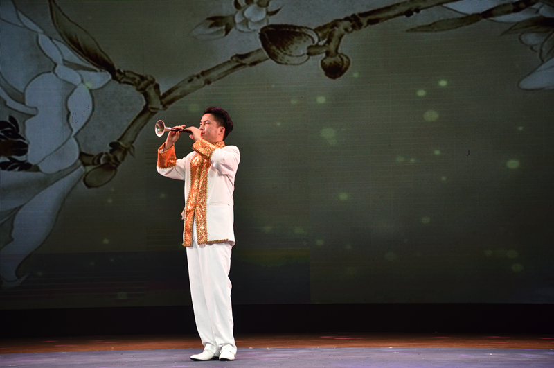 苏北赵家唢呐班第五代传承人赵海迪的唢呐独奏《百鸟朝凤》以热闹欢快的曲调,描摹了百鸟和鸣之声,歌颂了大自然的美景。