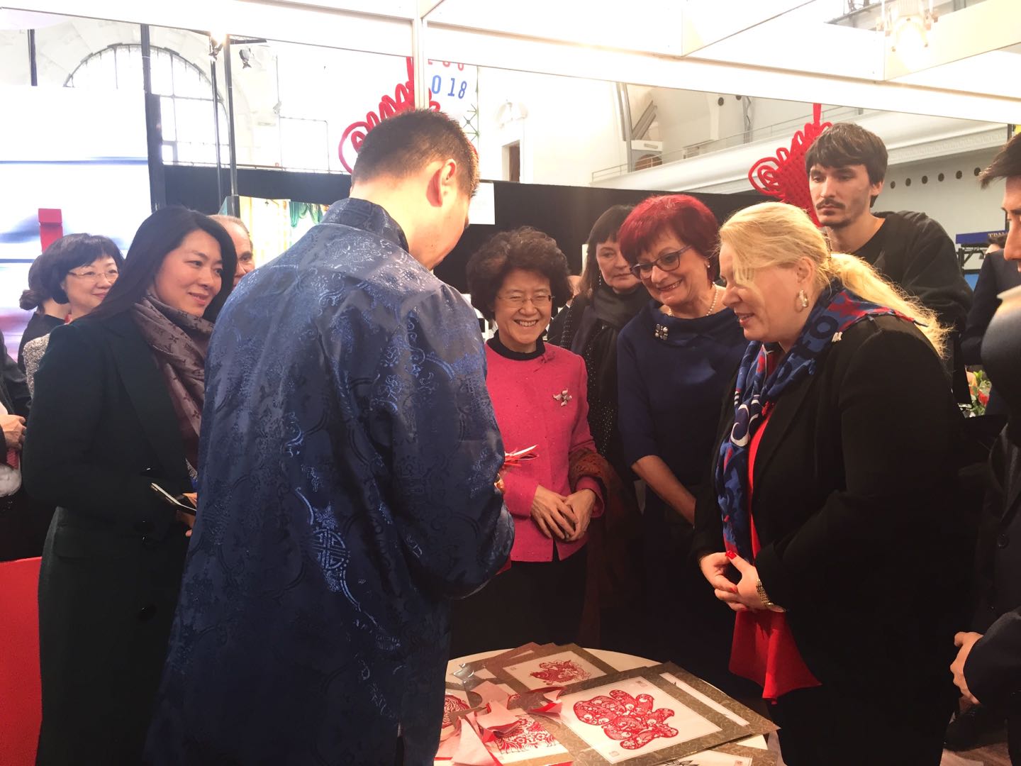 捷克地方发展部部长多斯塔洛娃饶有兴趣地观赏剪纸表演,与表演者热情交流