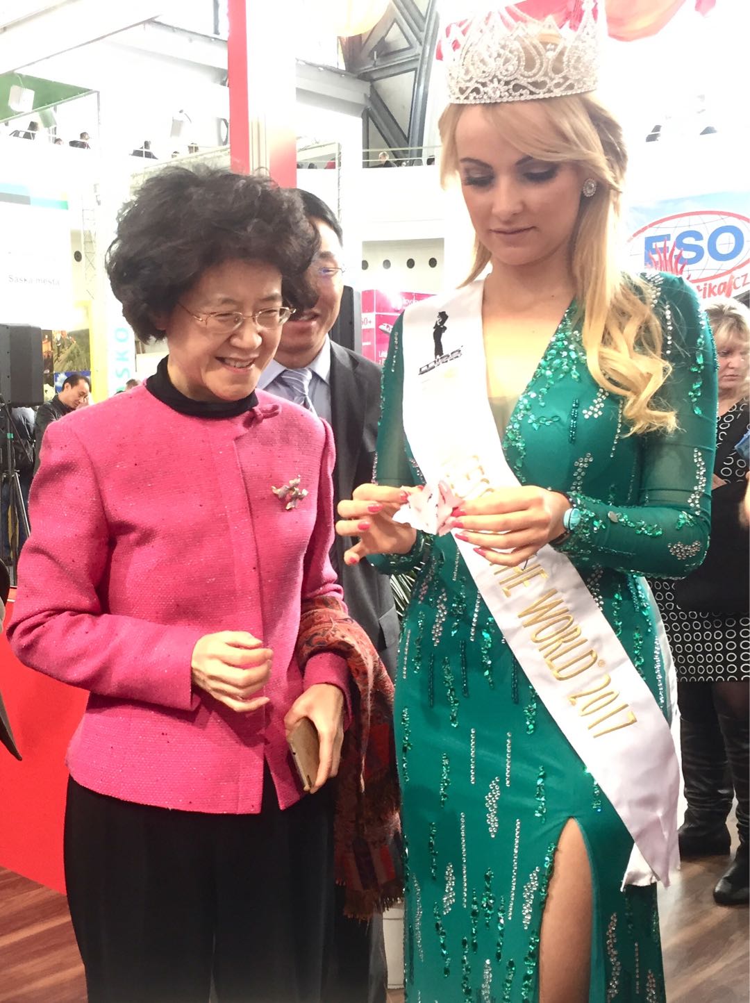 当地时间2月15日,在捷克首都布拉格展览中心,爱涛文化集团“欢乐春节·精彩江苏”文化艺术展演团为第27届捷克“假日世界”国际旅游交易会助力展演。驻捷大使马克卿女士、捷克地方发展部部长多斯塔洛娃女士、江苏省文化厅副厅长刘爱华、江苏省文化厅对外交流处副处长周云凤莅临中国展位,爱涛文化集团总经理陈云梅向来宾介绍了爱涛文化集团“欢乐春节·精彩江苏”文化艺术展演团为本次旅游交易会精心准备的展演节目。