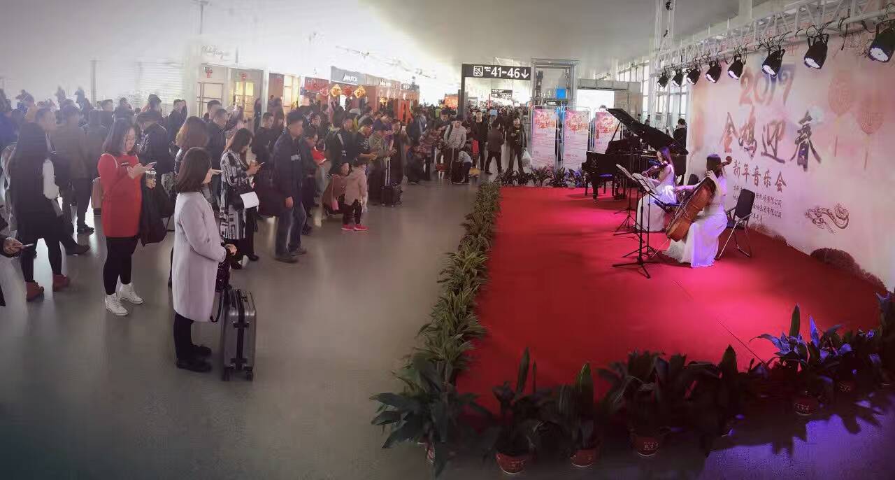 1月22日上午10时,随着一阵欢快的小提琴声响起,精品曲目《蓝色多瑙河》的曲调顿时飘扬在禄口国际机场候机楼内。爱涛交响乐团的艺术家们手中的大提琴、小提琴缓缓流淌出欢快的旋律,《土耳其进行曲》、《花好月圆》、《春节序曲》等优美的乐曲经过弦乐重奏的演绎,散发出别样的韵味,乘客们纷纷驻足聆听,享受音乐之美。