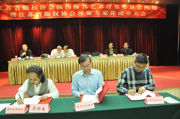 会上,爱涛文化集团同江苏省版权协会防伪保真艺术评鉴委员会、江苏凤凰国际拍卖公司签订战略合作协议,三方共同携手引领诚信消费新风尚,为江苏省艺术品市场保驾护航。